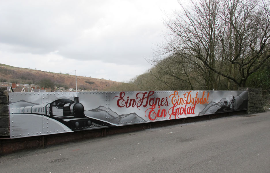 We held brainstorming sessions in the local community to come up with ideas for the murals… resulting in a mix of old and new style images to represent the present and past, and a number of quotes in Welsh. “Look to the future” – “Edrychwch i’r Dyfodol”, “Remember the past” – “Cofiwch y Gorffennol” and “Our History, Our Country, Our Future – “Ein Hanes, Ein Gwlad, ein Dyfodol.”