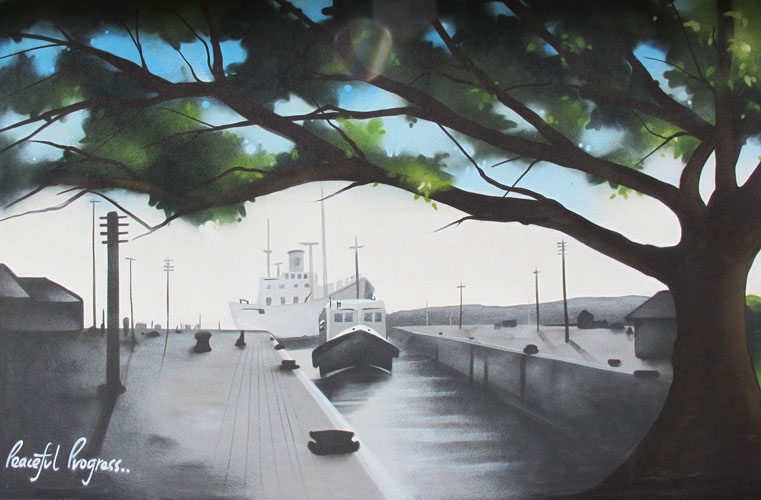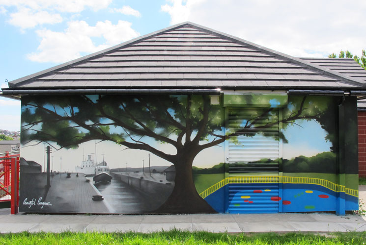 A new community led mural in Gibbonsdown, Barry. The project included a brainstorming session with the local school to come up with ideas for the mural. On the left is an image of Lady Windsor Lock in the infamous Barry Docks, and on the right is the new Splash Pad in the local Park. The central Oak tree represents the Area of Gibbonsdown which at one time was covered in Oak trees.