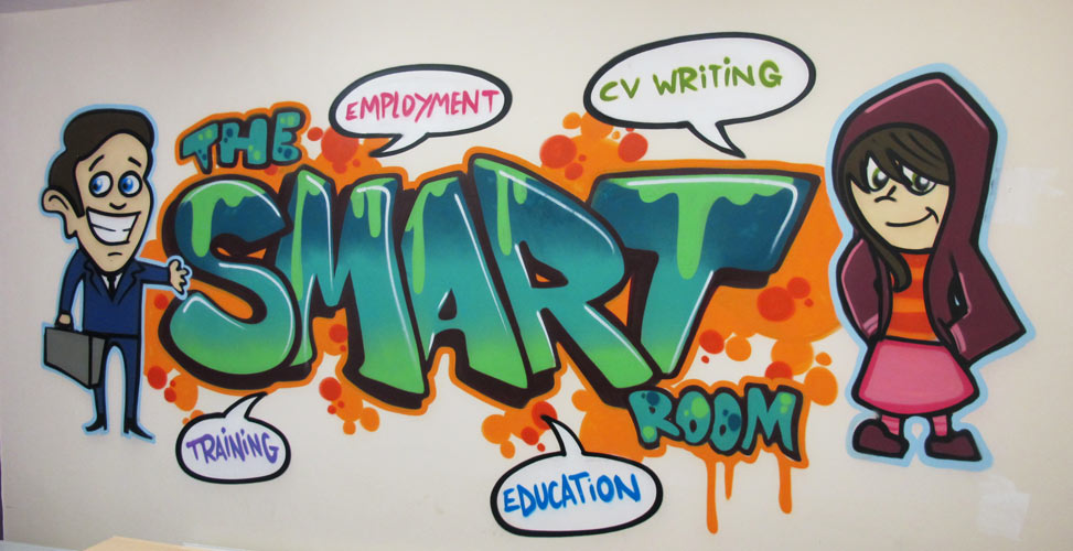 This is one of 2 murals painted for Gwalia, a non-profit organisation who provide housing care and support for young people. We’ve done a few Graffiti workshops on behalf of Gwalia, always well received. I’m looking forward to working with them more in the future!